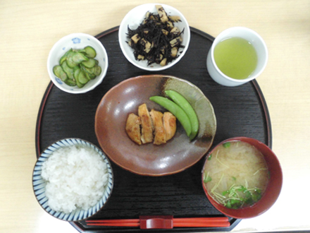 施設内の厨房で調理しています。お米は契約農家から玄米で取り寄せ、毎月精米しています。メニューの変更にも対応しています。